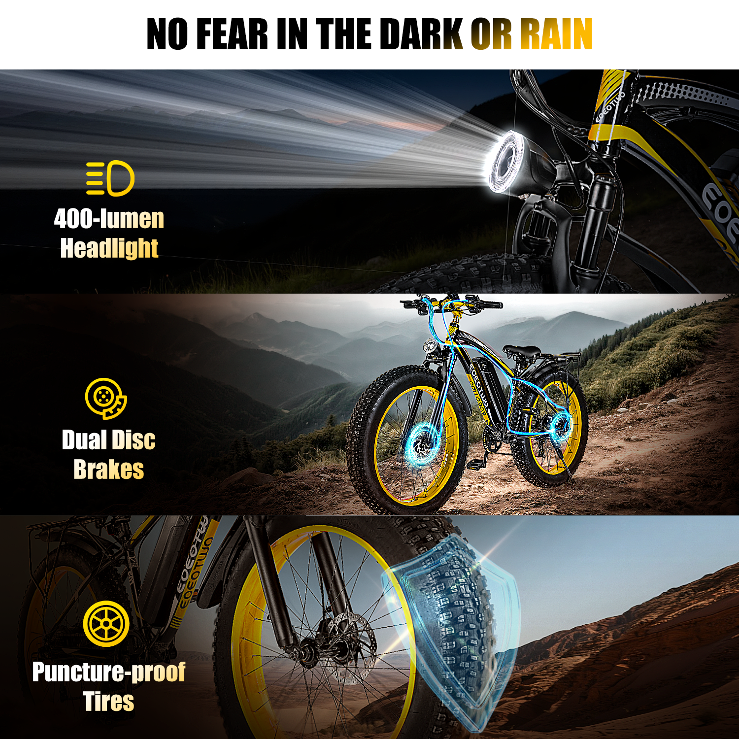 With a 1000W peak brushless motor, you’ll experience effortless acceleration and top speeds of up to 33 MPH. Hills, rough trails, or long rides—this e-bike turns challenges into pure thrill.