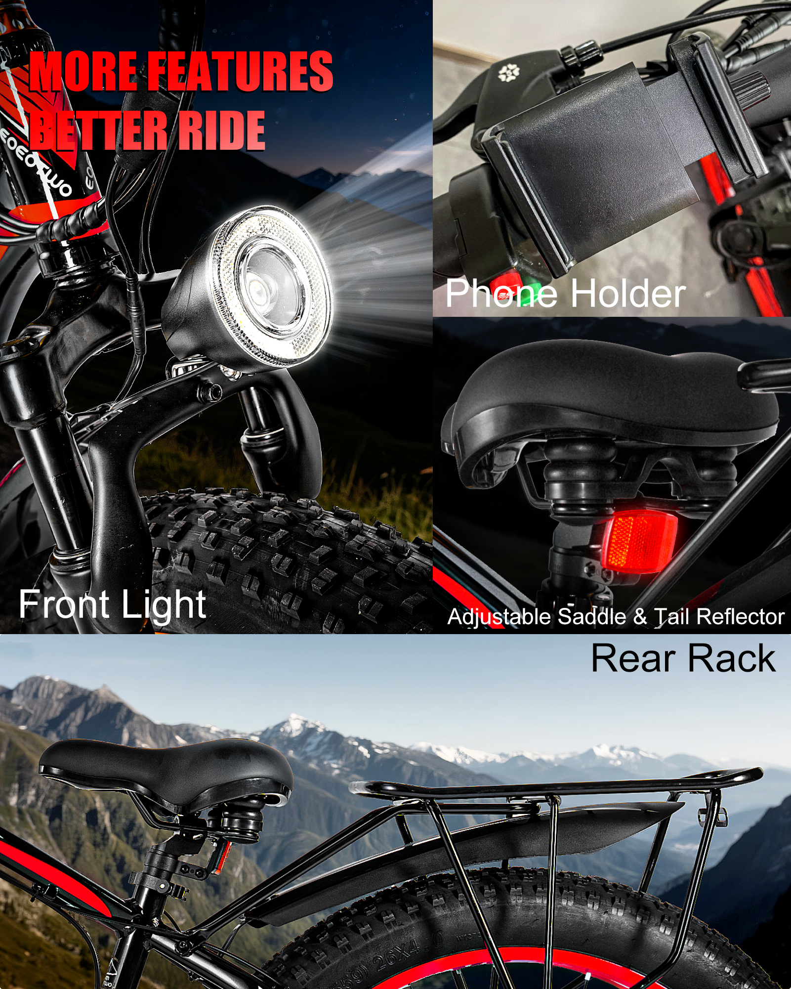 26"x4" fat tires grip any terrain with confidence, while dual disc brakes, a bright headlight, and a lockable battery keep you protected on every journey. The suspension fork and adjustable saddle guarantee a smooth, comfortable ride wherever you go.